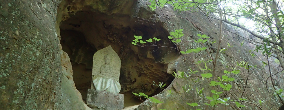 まずはヒキガエルの群れが天を仰いでいるように見えるという「ひき岩群」を探検。小さな岩峰群の間をぬって歩道が整備されています。第一展望台、第二展望台を経て、まさにカエルの横顔のようなひき岩を見学。お次は隣接する岩屋山へ。岩屋観音とよばれる、新西国三十三番霊場の石仏群を周回します。